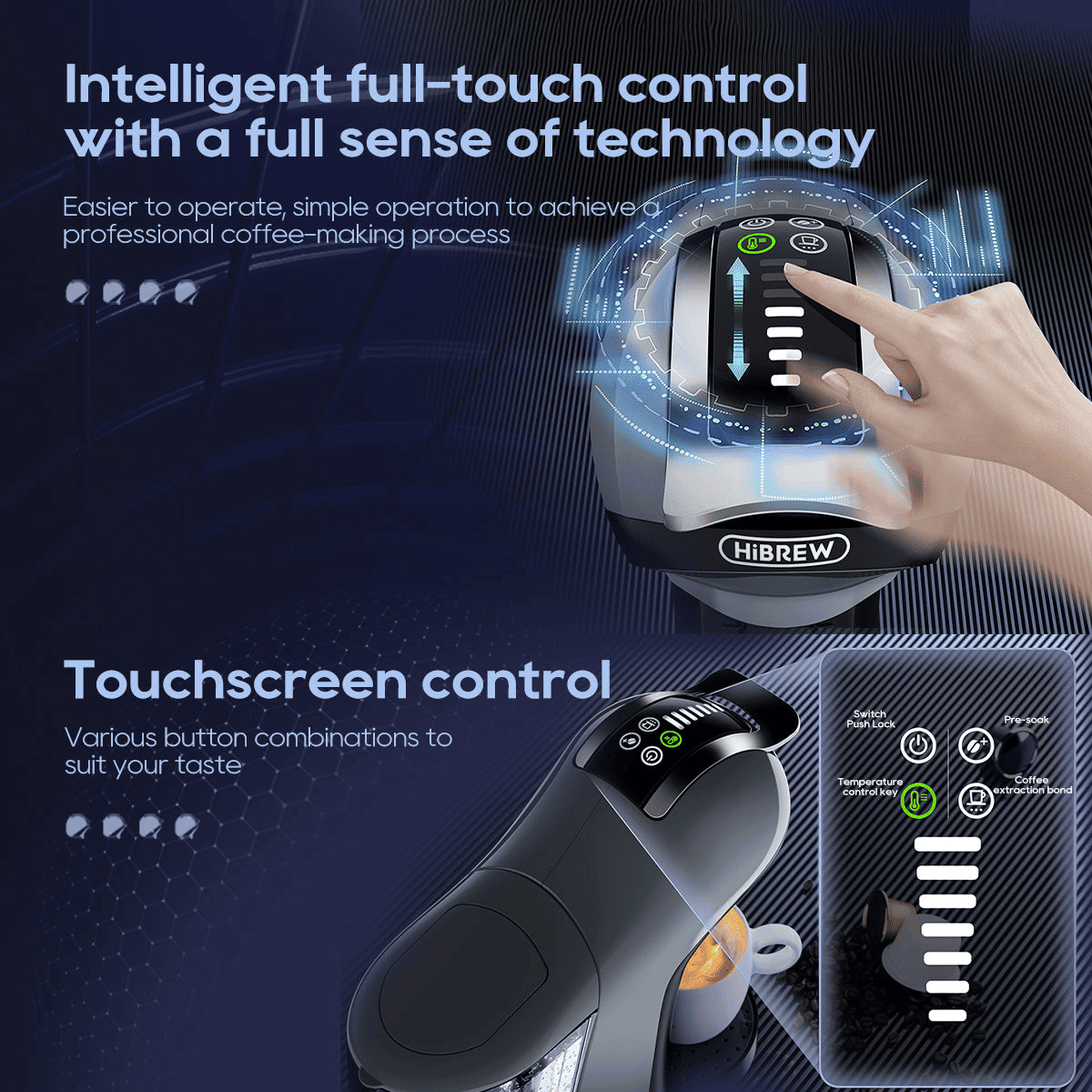 Features: Visual LED tracker (1-7) displays current settings; Touch control screen; Multi-level temperature adjustment; High-temperature evaporation; Multi-capsule compatibility; Adjustable coffee quantity; Water level indicator; Programmable; Temperature control; Single service; Cold/Hot coffee mode; Capsule extraction for espresso preparation