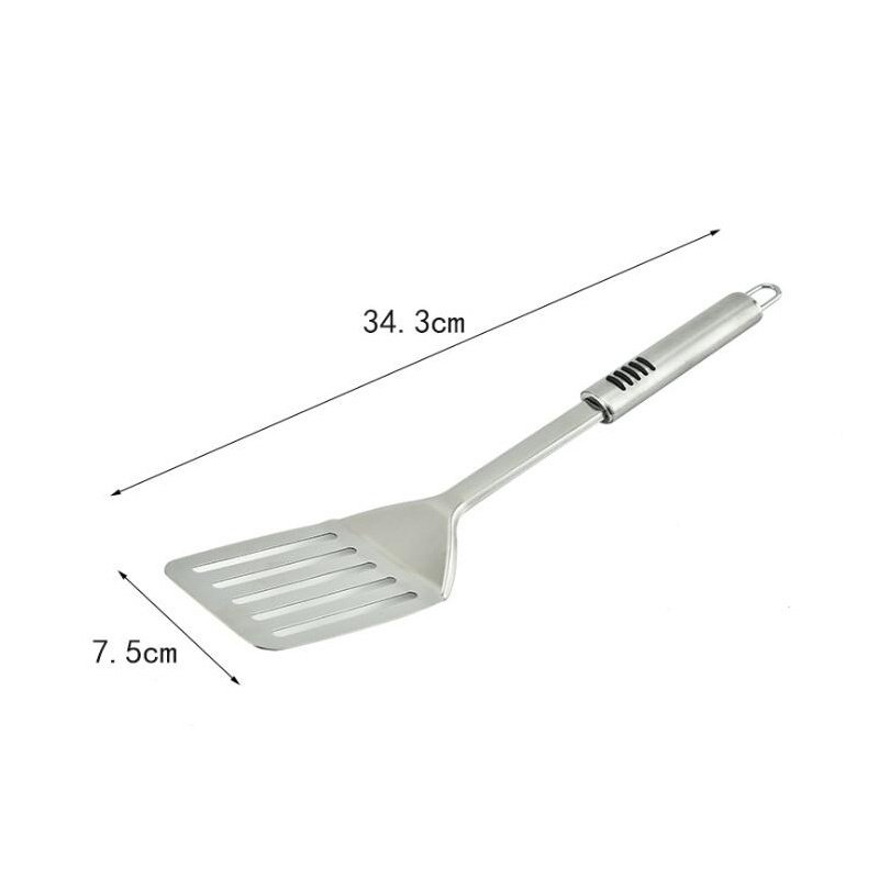 100% restaurant quality stainless steel turner, comfortable ergonomic grips are splinter-free (unlike wooden handles), slotted turner allows grease to drain, and is beveled for easy sliding beneath foods every time! Edged-ended for for functional cutting during grilling, acts as a knife.